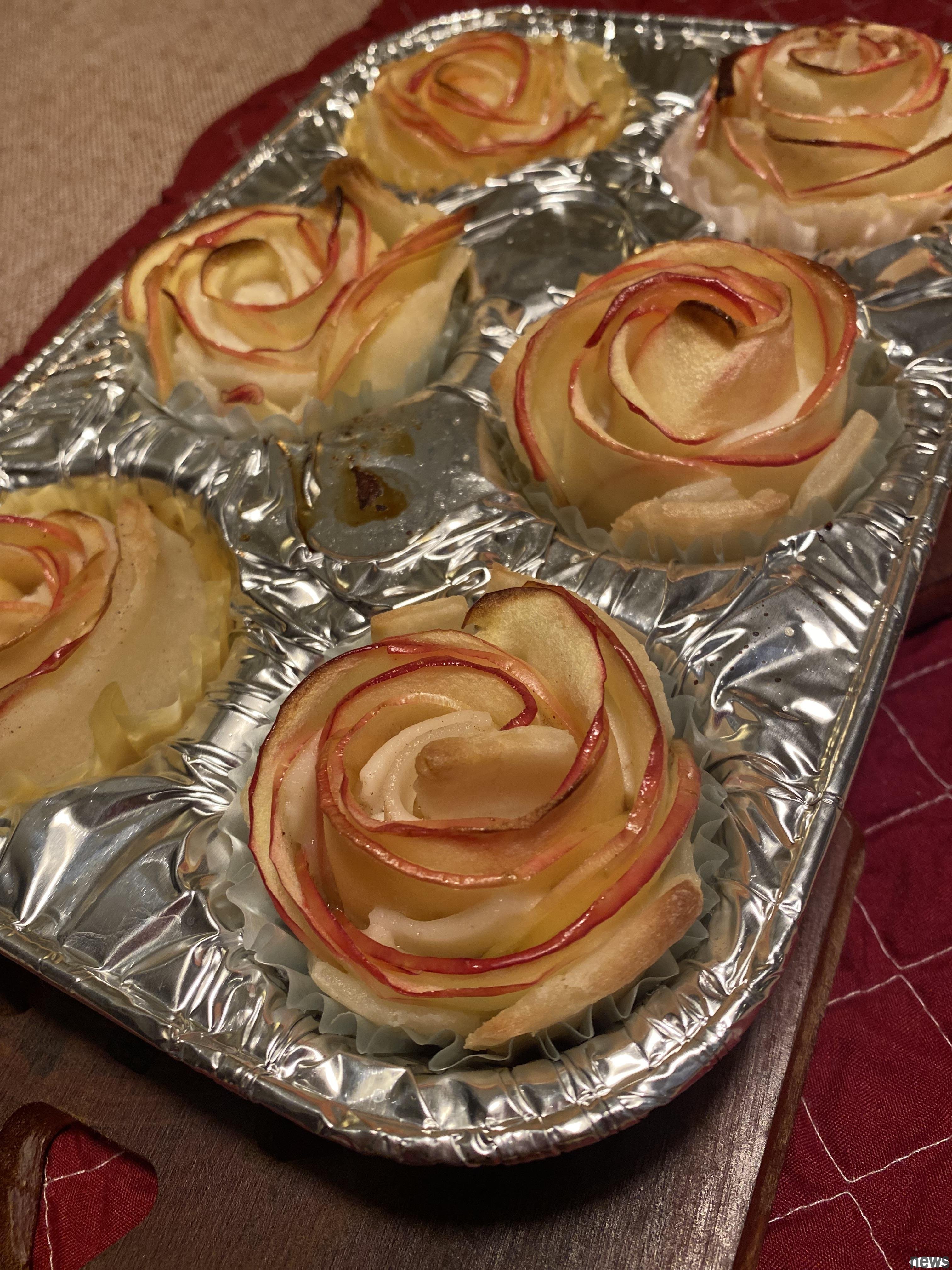 After the pie crust is slightly softened at room temperature, cut it into 6 cm wide strips. Overlay the soaked apple slices on the same side of the pie crust. The peel must extend beyond the pie crust. Sprinkle sugar and cinnamon on the pie crust and apple slices. Fold the half of the pie crust without the apple slices and press it onto the apple slices. Brush the folded pie crust with a thin layer of butter and roll it up slowly to form a rose. Then put the roses into the muffin pan and bake at 400 degrees until the apple skin is slightly charred, about 40-45 minutes. Cool for about 5 minutes and then take it out. Sprinkle lightly with powdered sugar to make it more colorful.
