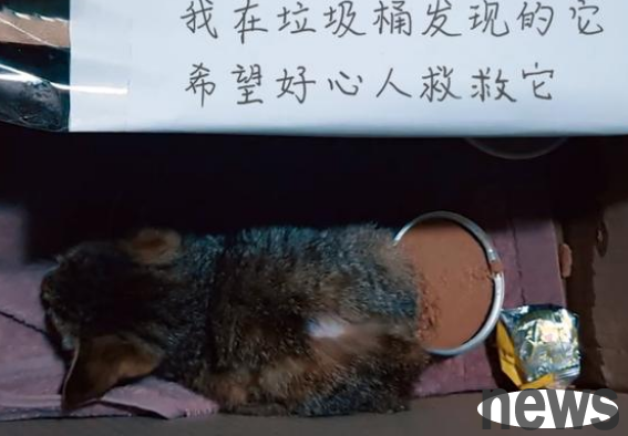 The moment the box was opened, the young lady was surprised and saddened by what was inside. It was actually a kitten! The tiny little cat huddled helplessly in the box, meowing hoarsely. There was a canned cat that had eaten a few mouthfuls next to it. There was a piece of paper taped to the cover of the box, with two lines of words written on it: "I found it in the trash can. I hope good people can save it."