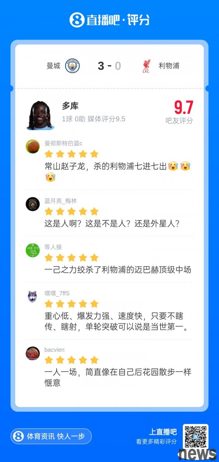In this game, Doku performed well, scoring a goal and creating a penalty kick. He attempted 7 dribbles out of 8 times and was successful. One person disrupted Liverpool's defense in the midfield and right wing. His friends gave him a high score of 9.7 points.