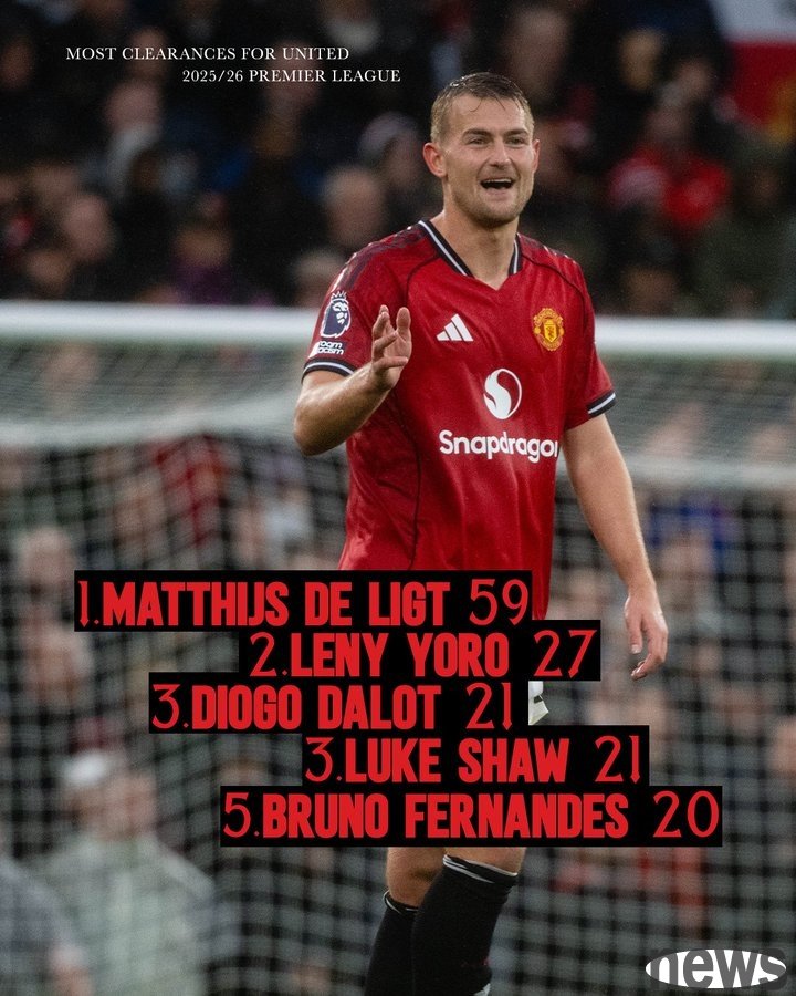 After 11 rounds of games this season, Manchester United is temporarily ranked 7th in the standings. According to the club's official statistics on the number of clearances made by players in the match, De Ligt topped the list with 59 times, and Yoro ranked second with 27 times.