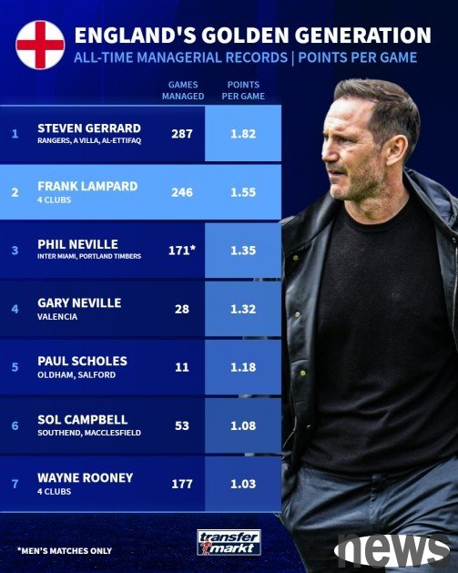 The German transfer market took stock of the coaching records of England's "golden generation" players. Gerrard ranked first with an average of 1.82 points per game, and Lampard ranked second with an average of 1.55 points per game.