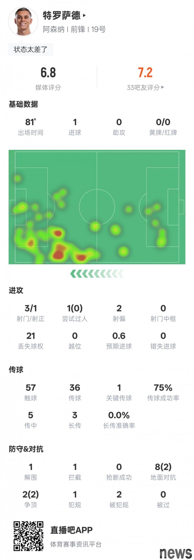 In the 8th round of the 2025-26 Premier League season, Arsenal played Fulham away. Trossard started the game, contributed 1 goal and sent 1 key pass, but also lost the ball 21 times, with a rating of 6.8.