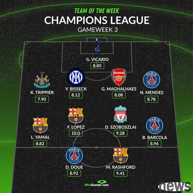 The third round of the UEFA Champions League has ended. WhoScored has also compiled the best lineups for this round. Paris and Barcelona each have 3 players on the list.